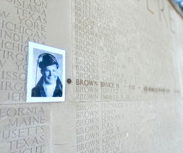 photo of Bruce Brown on a stone wall next to his engraved name