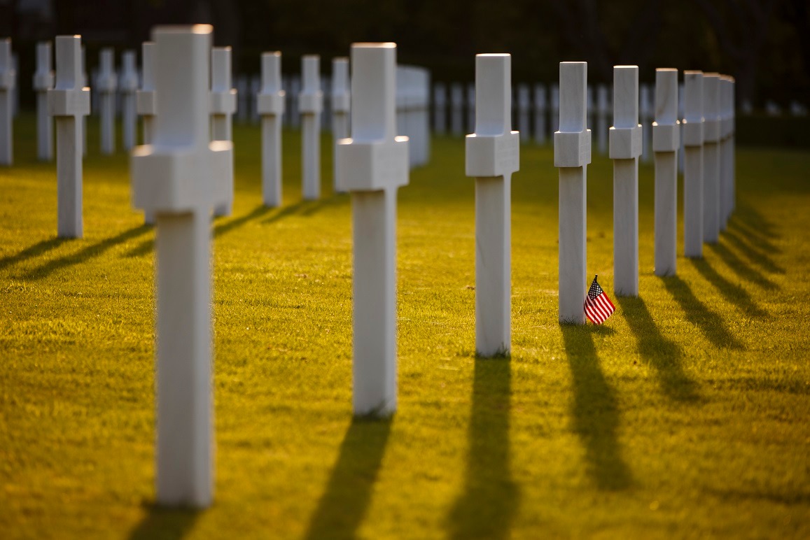 Rows of white marble cross headstones on green grass with American flag