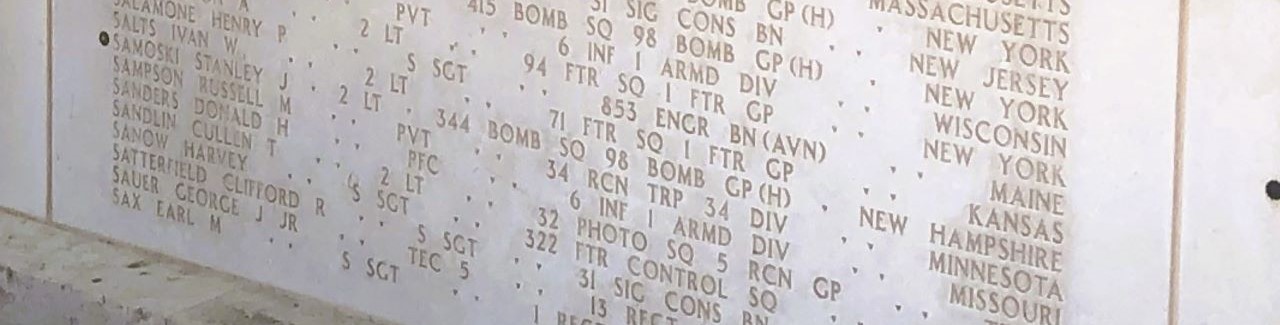 The engraved name of Stanley Samoski on a stone wall with a bronze rosette placed next to it