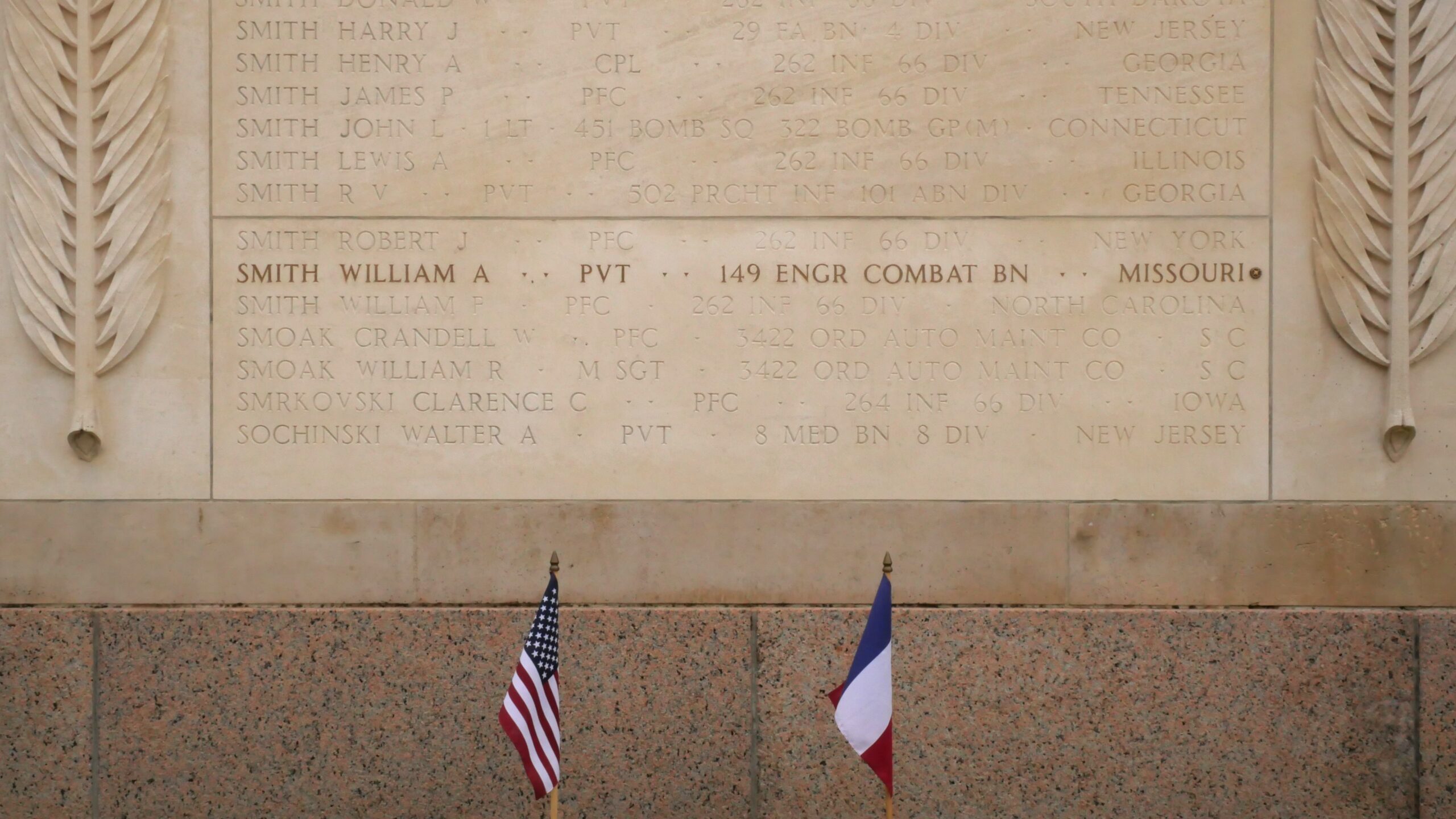 The engraved name of William Smith on the wall of the missing with a bronze rosette next to the name