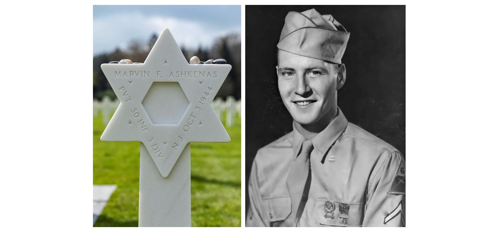 | Pvt. Marvin F. Ashkenas from Bloomfield, New Jersey – Pvt. Ashkenas was born in 1922 in New York City to Russian Jewish immigrants and was later adopted by an aunt and uncle after his parents’ deaths when he was very young. He enlisted in the Army in 1942 and was killed in action during the liberation of northern France on October 3, 1944. His tags were lost, and his injuries were very severe, which made identification difficult. Ashkenas was given a temporary grave marker and a non-denominational funeral ceremony at Epinal American Cemetery, France, with his religion being listed as “unknown.” After a few years of unanswered correspondence to his widow, Pvt. Ashkenas’s gravesite was marked with a Latin cross. He is buried Plot A, Row 44, Grave 9. |