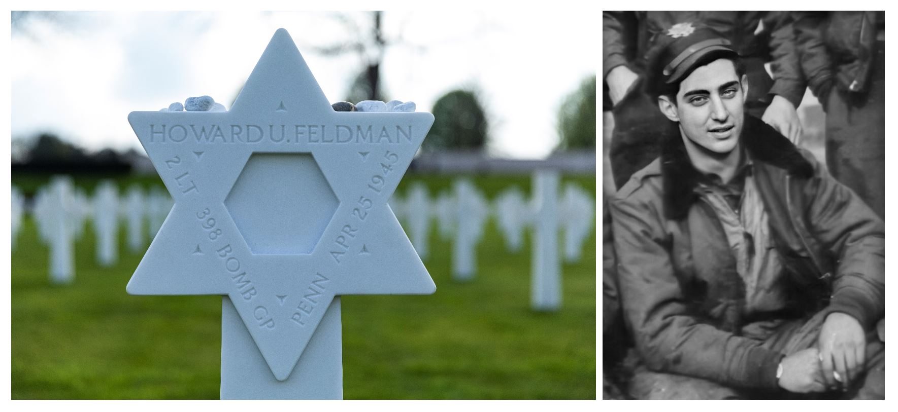 | Lt. Howard U. Feldman from Allentown, Pennsylvania – Howard Feldman, born in 1923, graduated from Allentown High School in Allentown, Pennsylvania and enlisted in the Army in 1943, and was commissioned as an officer. He trained as a navigator on B-17 heavy bombers and was dispatched to the 8th Air Force Headquarters in England, earning an Air Medal with three Oak Leaf Clusters. On April 25, 1945, Lt. Feldman was part of the crew aboard “Godfathers Inc.,” flying near Pilsen, Czechoslovakia, when the ship was hit by anti-aircraft fire. The Lieutenant and five of his crewmates were killed and buried by civilians in a common grave in the cemetery in Litice, Czechoslovakia. Lt. Feldman was officially “Missing in Action” for two months before the Army was able to declare that he and his crewmates had died. Despite information to the contrary, he was listed as “Catholic,” and his final resting place at Lorraine American Cemetery, France was marked with a cross, which his nieces and nephews are now profoundly gratified to correct. He is buried Plot A, Row 28, Grave 6. |