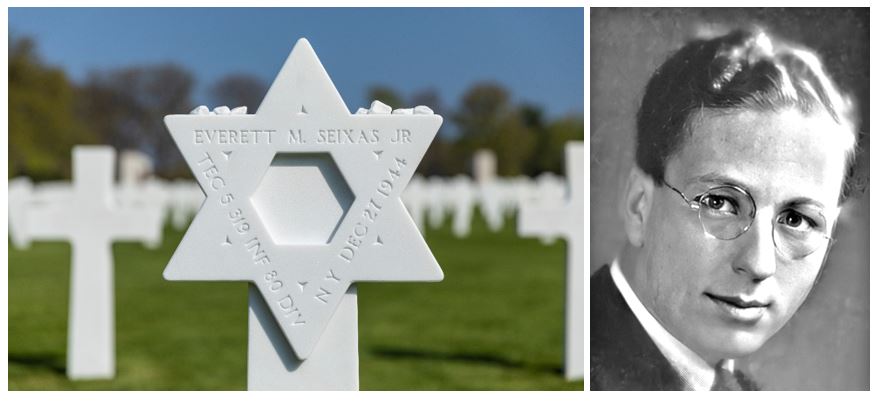 | Tech. 5 Everett M. Seixas Jr. from New York, New York – Everett Moses Seixas, Jr., was born in New York City on November 28, 1911 – the only child of Everett Moses Seixas and Alma Tenner. He graduated from Horace Mann School, attended Brown University, and earned his Juris Doctor at Columbia University Law School in 1935. His lineage included Mendes Seixas, the famous Revolutionary War-era rabbi, and Mendes’s brother, Moses, the lay-leader of Rhode Island’s Touro Synagogue – the first synagogue in America – whose letters won President George Washington’s famous pledge of security for Jews. Everett Jr. enlisted in the Army in 1943. He was assigned to the 319th Infantry Regiment, 80th Division which landed at Utah Beach in August of 1944. Cpl. Seixas was killed in action during the infamous Battle of the Bulge on December 27, 1944. While his identification tag may have included a “P” (for “Protestant”), it was not uncommon for Jewish soldiers to hide their faith if they knew they were headed to Europe. In an unfortunate oversight, the War Department had no indication that Seixas was Jewish. He was buried under a cross at Luxembourg American Cemetery, Luxembourg on November 30, 1948 – a full four years after his death. He is buried Plot H, Row 2, Grave 40. |