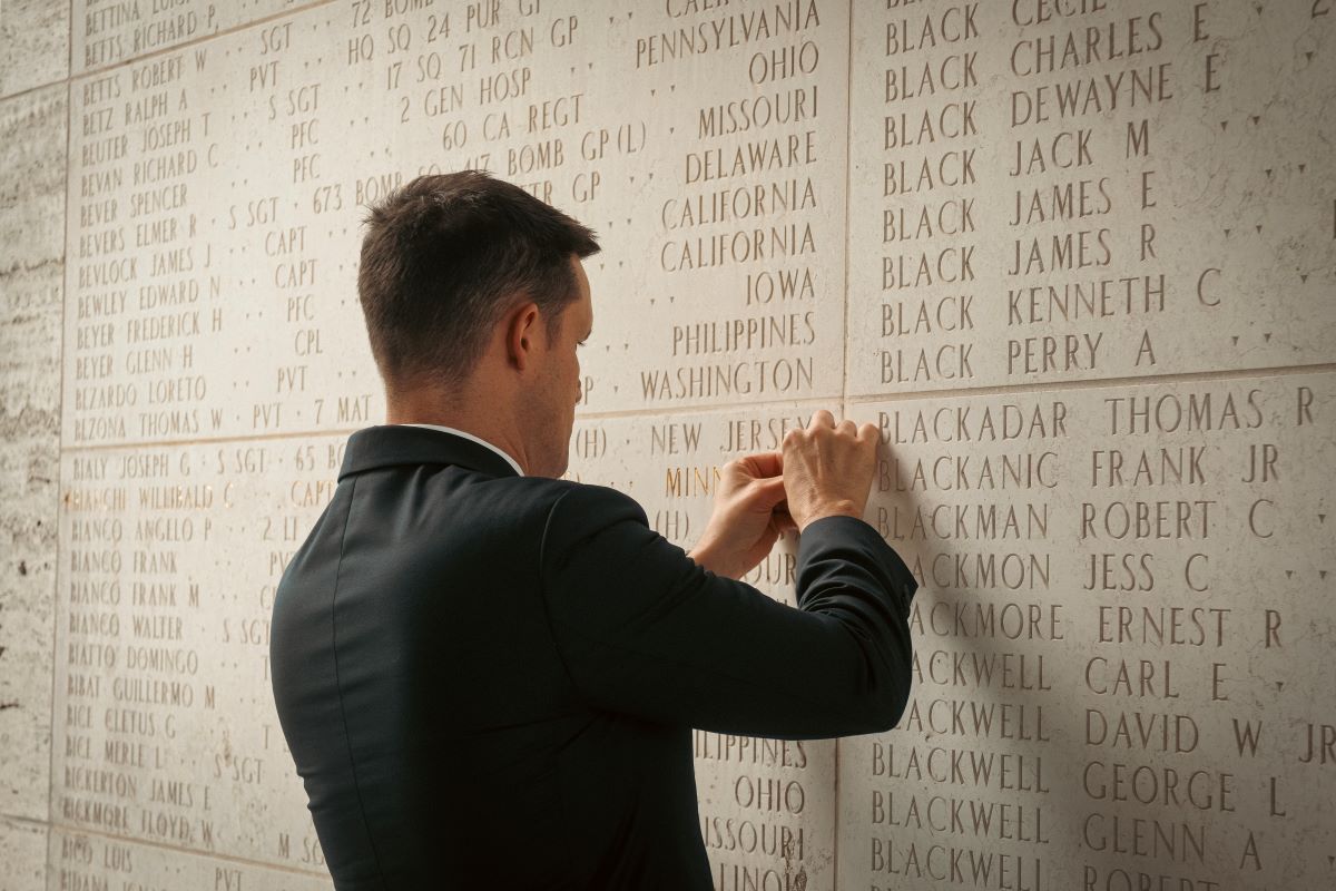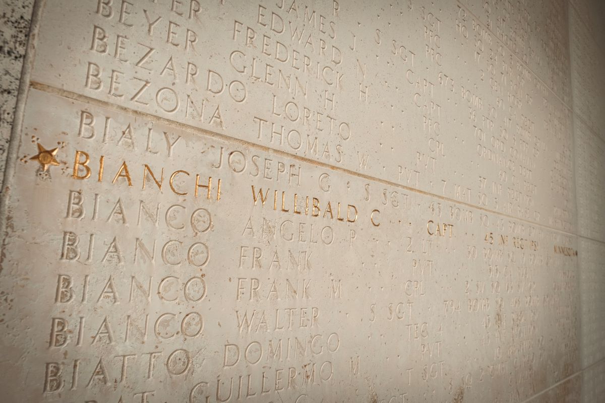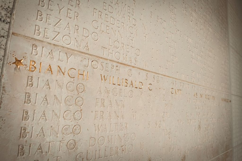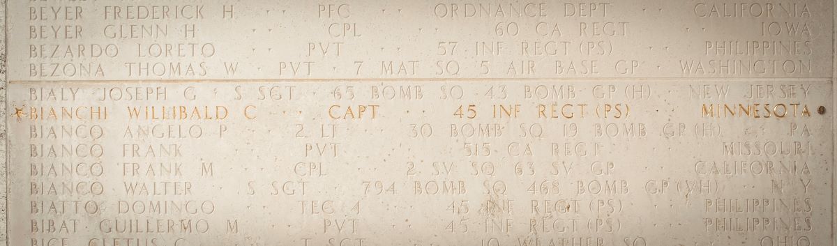 ARLINGTON, Va. (Sept. 19, 2025) — The name of U.S. Army Capt. Willibald C. Bianchi, engraved in stone and overlaid with gold, on the Walls of the Missing at Manila American Cemetery now has a bronze rosette next to it signifying he has been identified.